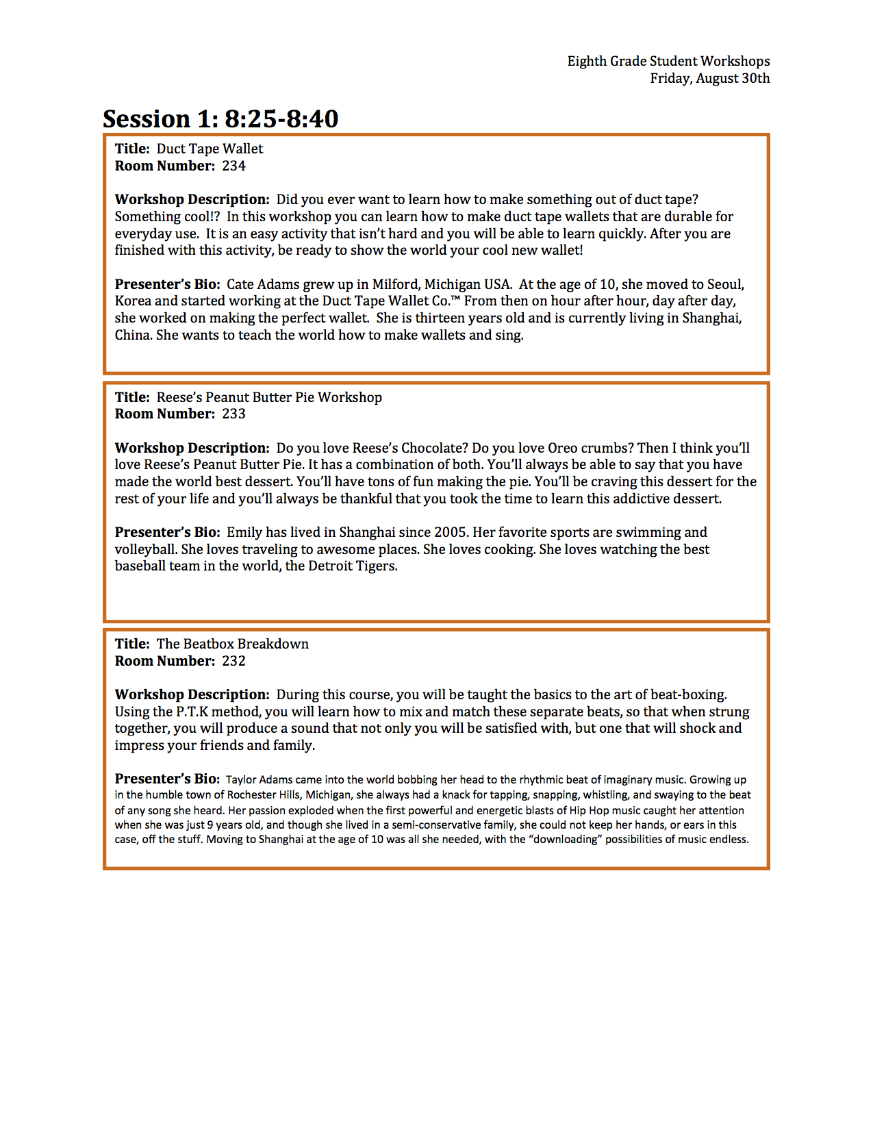 On Friday, August 30th you will be presenting to your peers an area that you have a special talent in, The below is to be completed by Monday at the end of the period to possibly be selected on Tuesday, August 27th.